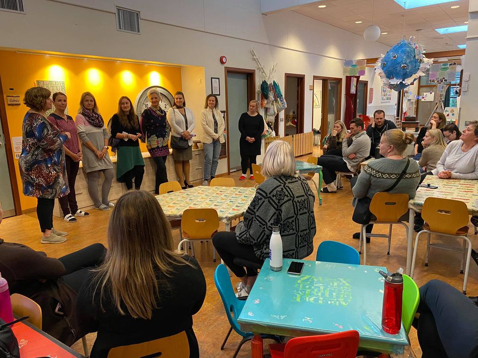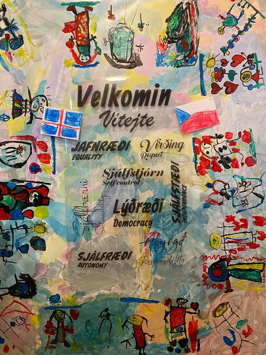 Í gær fengum við frábæra heimsókn frá samstarfsskóla okkar í Tékklandi. Til okkar komu sjö kennarar sem voru að kynna sér starfið okkar þá sérstaklega hvernig við vinnum með lýðræðið í leikskólanum. Samstarfsverkefnið okkar snýr að því að við erum að aðstoða þau við að innleiða lýðræði í sinn skóla. Þau koma frá sameiginlegum leik-og grunnskóla sem er heitir Základní Skola og er í litlum bæ rétt fyrir utan Prag. Í leikskólanum þeirra eru 10 deildir með þriggja til sex ára börnum og eru 24-28 börn á deild eða um 260 börn í leikskólanum. Í grunnskólanum eru í kringum 510 börn.