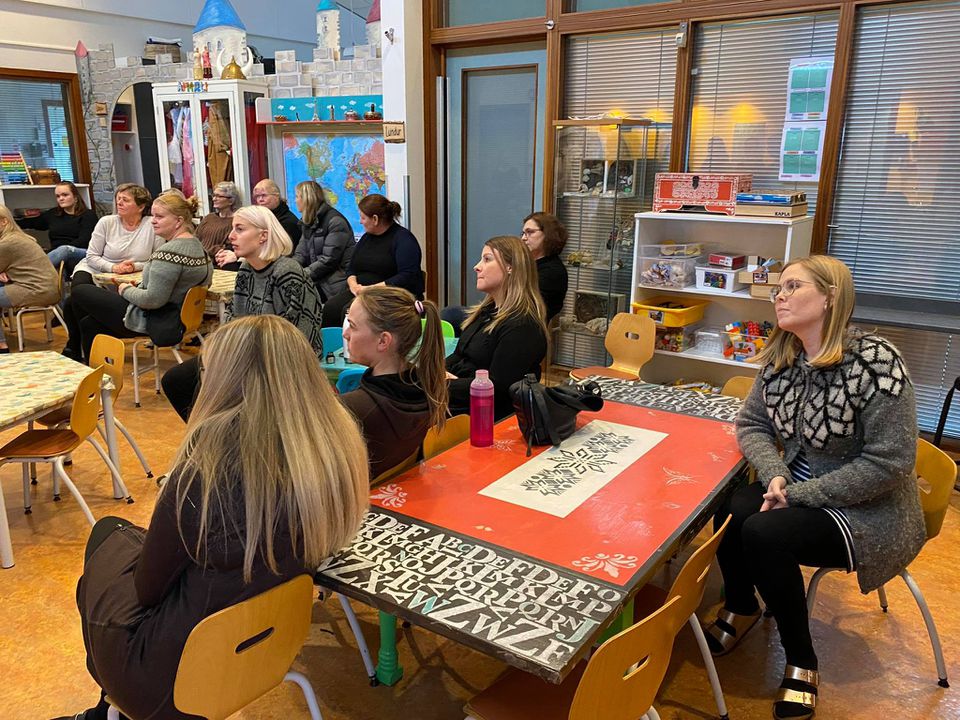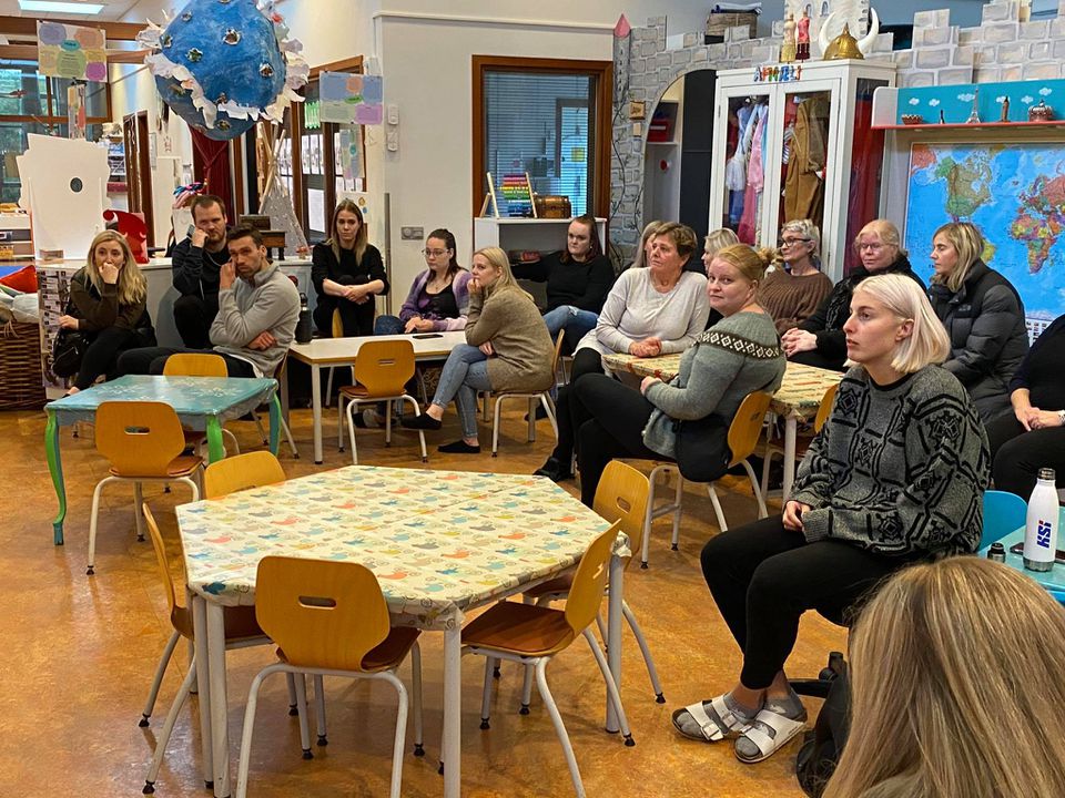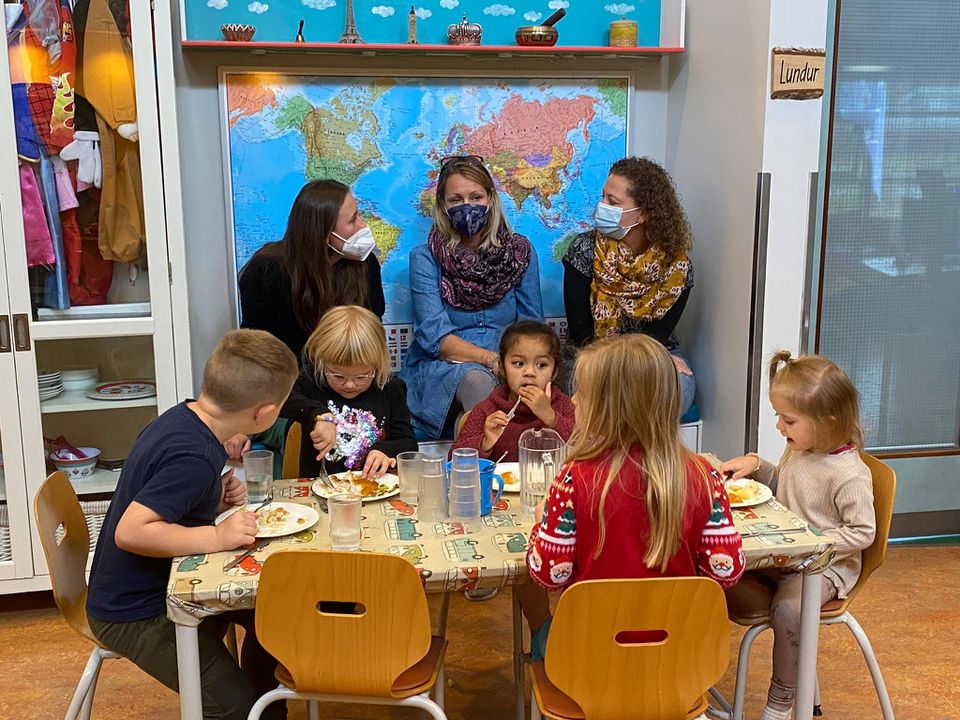 Krakkarnir í Rjúpnahæð voru mjög spennt að hitta kennarana og reyndu sumir að tala við þau á ensku og fannst þeim það dásamlegt. Hrönn, Margrét og Jóhanna settust fyrst niður með þeim og kynntu stefnu leikskólans fyrir þeim, svo fóru þau túr um leikskólann og fylgdust með í flæðinu. Eftir flæðið skiptu kennararnir sér niður á þrjár elstu deildirnar og voru með þeim í samverustund, fylgdust með vali hjá þeim, skrá sig inn og út, þau fylgdust með flæðismatnum og sáu hvernig dagurinn hjá okkur í Rjúpnahæð er.