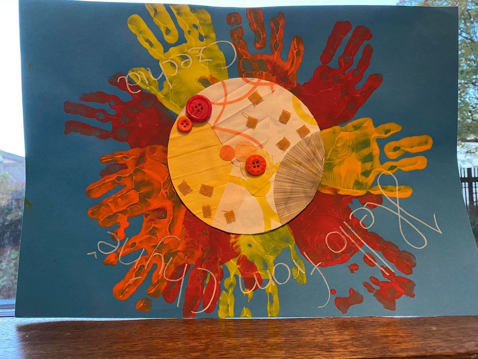 Kennararnir komu færandi hendi þar sem þau komu með teikningar frá börnunum í skólanum úti, þau komu með regnbogasteina og færðu svo starfsfólkinu smá á kaffistofuna.