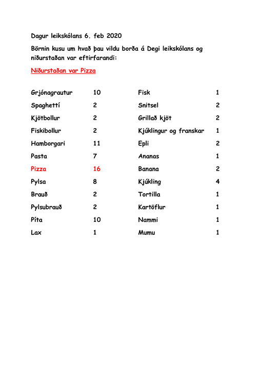 Dagur leikskólans er núna á fimmtudaginn 6.febrúar. Eins og við höfum gert síðastliðin ár spurðum við börnin annarsvegar hvað þau vilja hafa í matinn á degi leikskólans og hinsvegar hvað þau vilja hafa í kaffitímanum, stóð ekki á svörum hjá börnunum og eru hugmyndirnar í ár mjög fjölbreyttar. Síðan voru hugmyndirnar teknar saman og kosið úr þeim. Niðurstöðurnar voru pizza í hádegismatinn og súkkulaðikaka í kaffinu, sjá má niðurstöðurnar á myndunum hér með fréttinni.