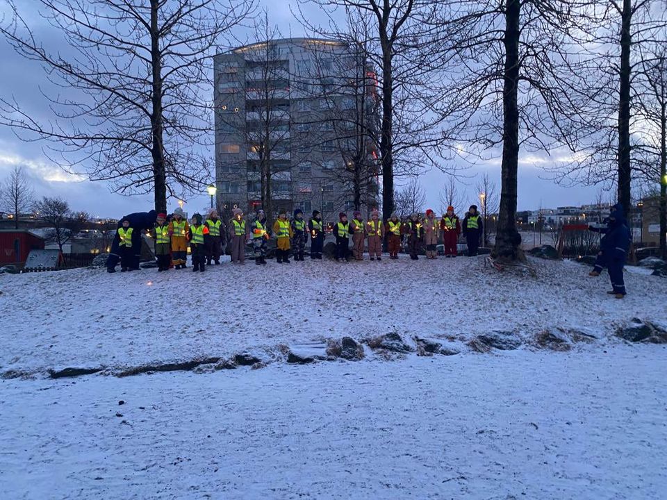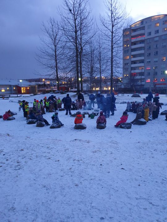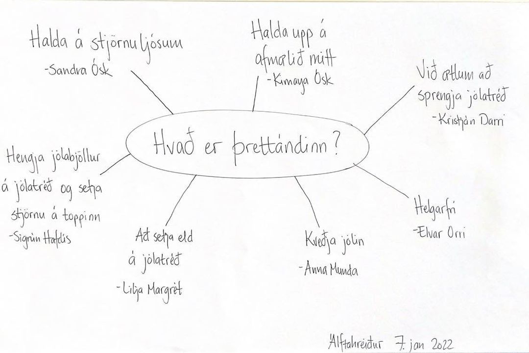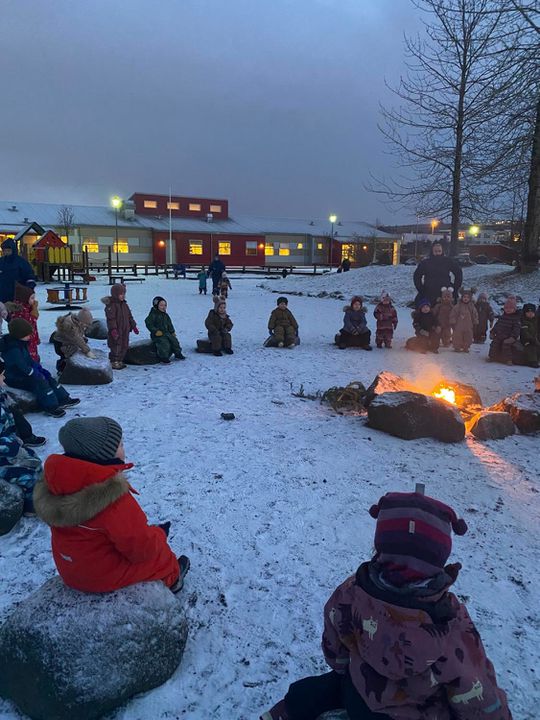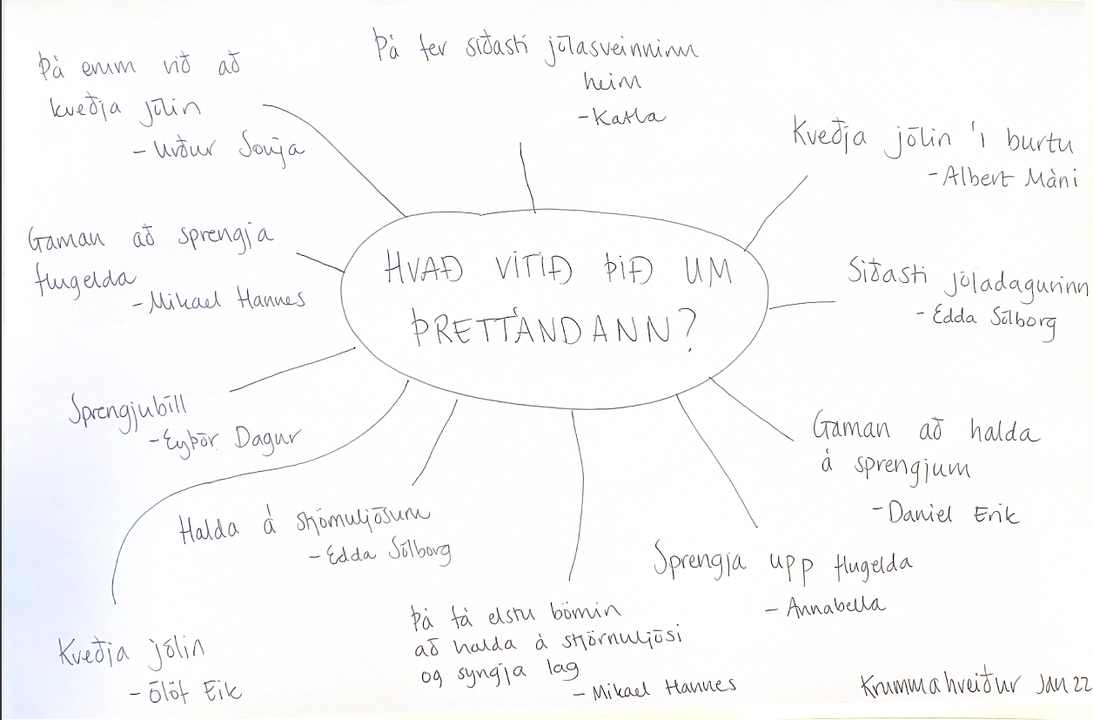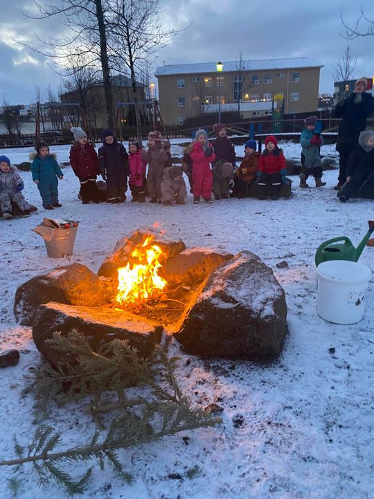 Við héldum upp á þrettándann í dag og kvöddum jólin við hátíðlega athöfn við varðeld í morgun. Í vikunni hefur fræðsla og umræða um þennan dag átt sér stað og af hverju við höldum upp á hann. Gerð voru hugarkort inni á deildum í þeim tilgangi að fá fram sýn barnanna. Þau voru með það á hreinu að þrettándinn táknar að jólin séu búin, að þá séu jólasveinarnir farnir aftur heim til sín og á eldri deildunum fræddust þau um gamla íslenska þjóðtrú um talandi kýr, álfa sem flytjast búferlum og ýmislegt fleira.