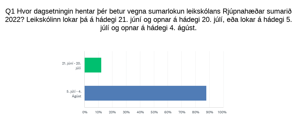 Samkvæmt könnun sem var send á foreldra og starfsfólk í síðustu viku um hvort tímabilið hentar fyrir sumarlokun þá varð seinna tímabilið fyrir valinu. Sumarlokun leikskólans er þá frá hádegi 5. júlí og leikskólinn opnar á hádegi 4. ágúst.