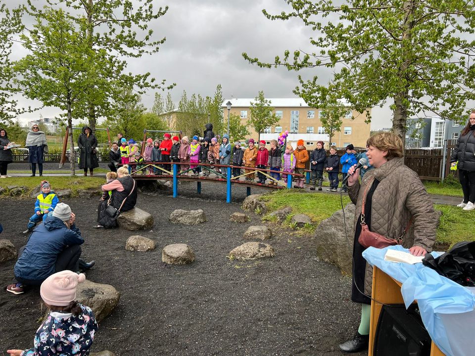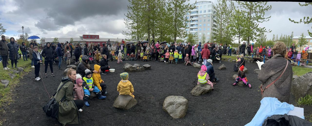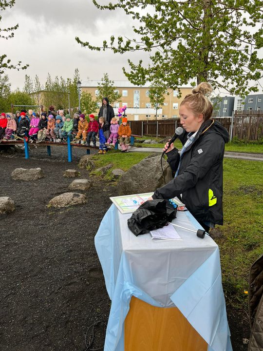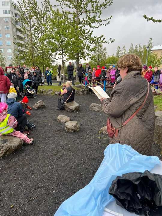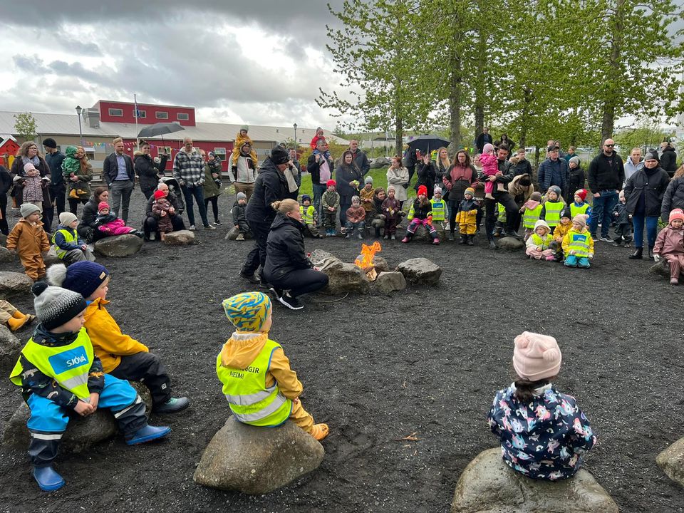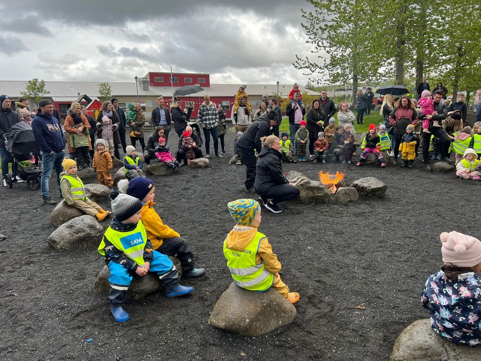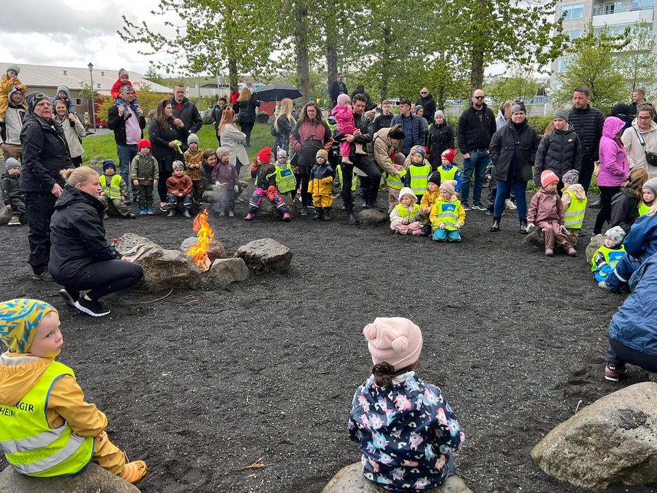 Klukkan 14:00 var hátíðin sett, við vorum búin að óska eftir sól, við fengum eitthvað af henni en það fylgdi einnig rigning ;) Við fengum ekta íslenskt veður. Við héldum okkur þó við að setja hátíðina úti við varðeld þar sem Hrönn var með smá tölu, Krummahreiður söng fyrir okkur tvö lög og afmælissöngurinn sunginn. Margrét las upp eitt erindi úr ljóði Kristjáns Hreinssonar um Rjúpnahæðarleiðina og svo afhenti Unnur deildarstjóri á Álftahreiðri leikskólanum gjöf sem var ljóð eftir öll börnin í leikskólanum. Unnur vann ljóðið með þeim, þar sem þau komu með orðin og Unnur setti saman, dásamlega fallegt ljóð. Hildur Margrét formaður foreldrafélagsins afhenti leikskólanum blóm og afmæliskökur fyrir hönd félagsins og hélt smá ræðu. Benedikt búálfur kom til okkar í boði foreldrafélagsins og leikskólans, hann ætlaði að vera úti en vegna veðurs áhvað hann að vera inni. Hlaðborðin sem voru úti færðum við einnig inn þar sem veðrið var aðeins að stríða okkur. Dásamlegur dagur þar sem allir voru með sól í hjarta.