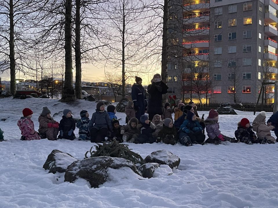 Elstu börnin í Rjúpnahæð hafa í gegnum tíðina fengið það hlutverk að saga jólatréð niður og syngja nokkur lög með stjörnuljós við hönd. Þetta árið voru það börnin á Arnarhreiðri sem fengu þetta skemmtilega verkefni. Þau sungu lögin "Í skóginum stóð kofi einn" og "Álfareiðin" síðan sungu allir saman nokkur lög með Hrönn leikskólastjóra sem forsöngvara til að kveðja jólin með stæl. Á meðan ljúfir tónar fylltu garðinn brann jólatréð í mikilfenglegri brennu í miðjum hringnum.
